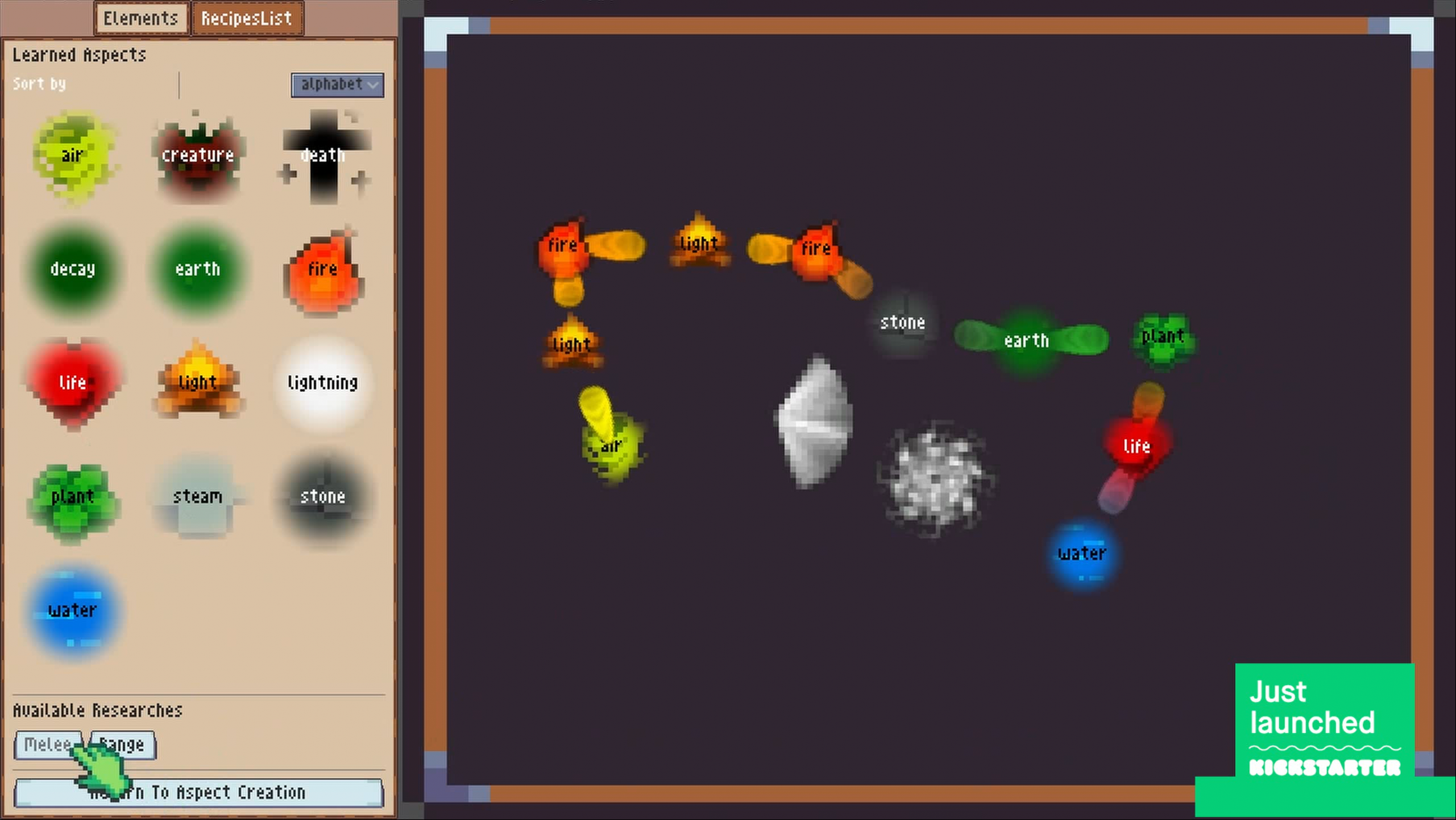 Specifically, the game has a foundational system that drives all other systems - the Aspect System. It's simple: think of it as basic chemistry, but simplified. You have aspects like Fire, Water, Air, and Earth, and you can transform them into others. For example: Fire + Water = Steam, Earth + Fire = Stone, Stone + Water = Ice.